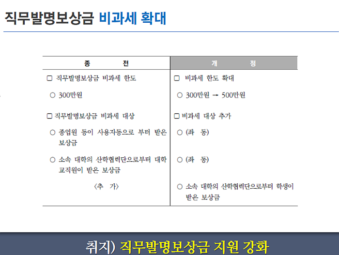 종전 : 직무 발명 보상금 비과세 확대 300 만원
