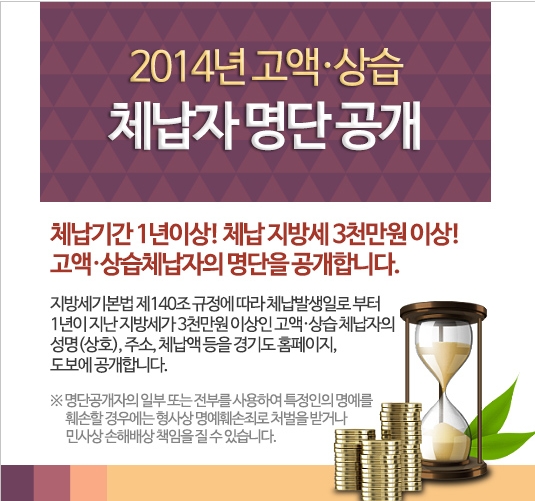 명단공개 대상자들은 지방세 기본법 제140조에 따라 체납 발생일부터 1년이 지나고 체납된 지방세가 3천만원 이상인 체납자로 공개항목은 체납자의 성명·상호(법인명), 나이, 주소, 체납액의 세목·납부기한 등이다....