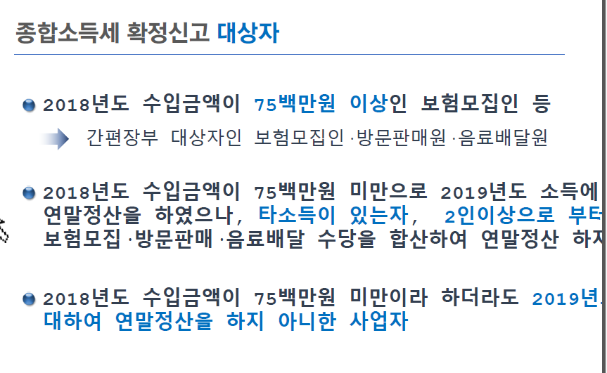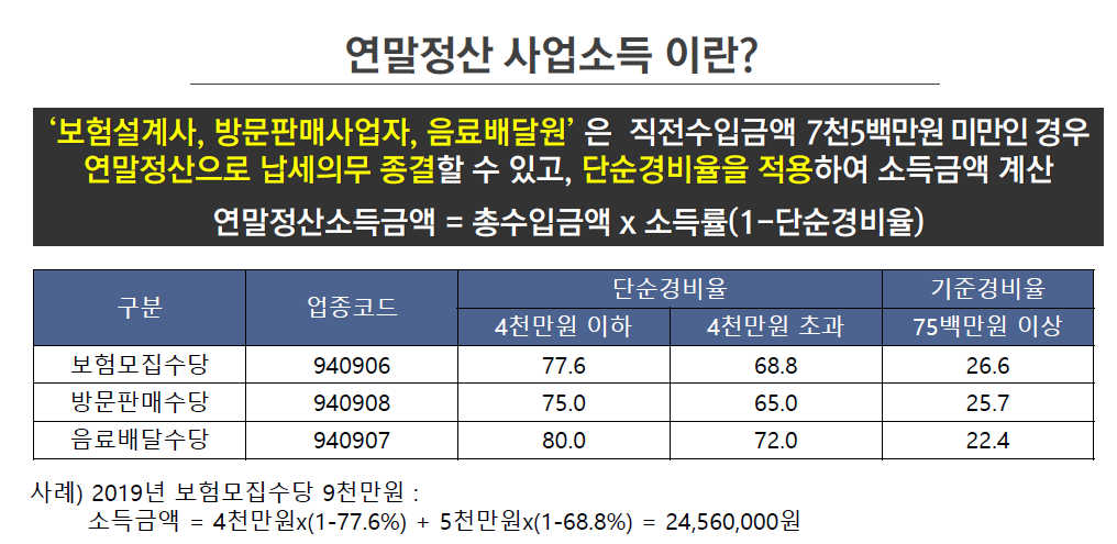 ‘보험설계사 ,방문판매사업자 ,음료배달원 ’은 직전수입금액 7천5백만원 미만인 경우 연말정산으로 납세의무 종결 할 수 있고, 단순경비율을 적용 하여 소득금액 계산
