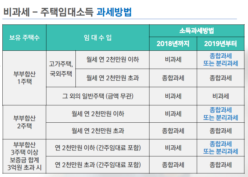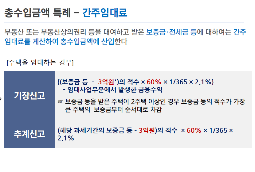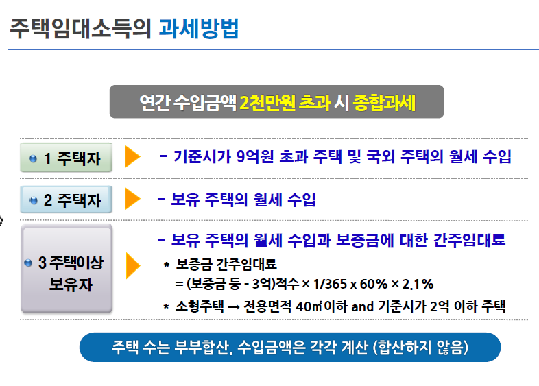 - 3 주택이상 보유자 : 보유 주택의 월세 수입과 보증금에 대한 간주임대료