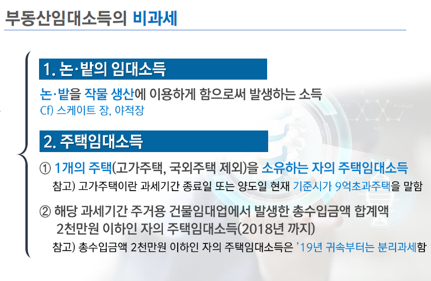 - 1주택자 : 기준시가 9억원 초과 주택 및 국외 주택의 월세 수입