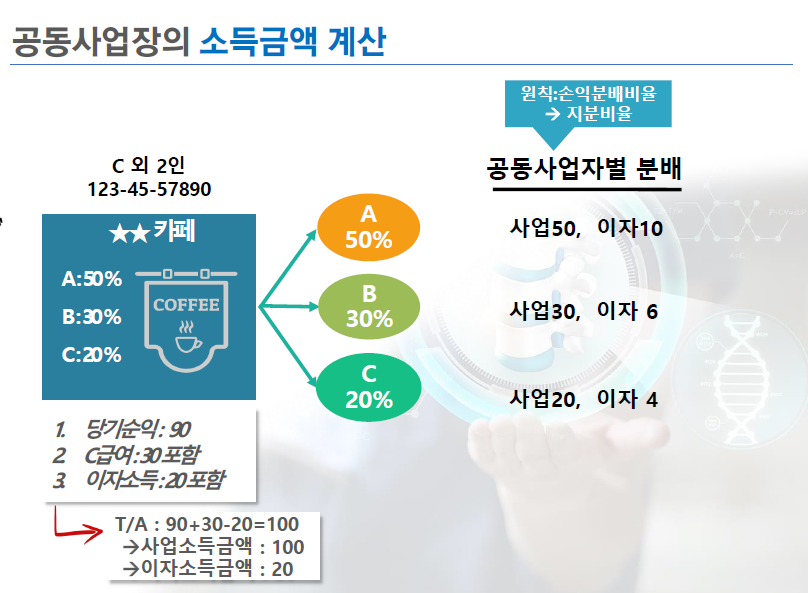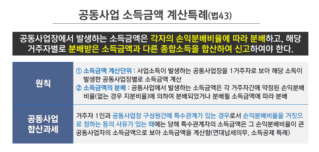 : 공동사업장에서 발생하는 소득금액은 각자의 손익분배비율에 따라 분배 하고 , 해당 거주자별로 분배받은 소득금액과 다른 종합소득을 합산하여 신고 하여야 한다.