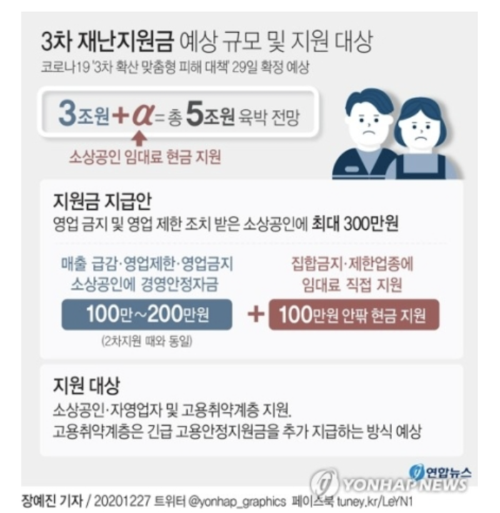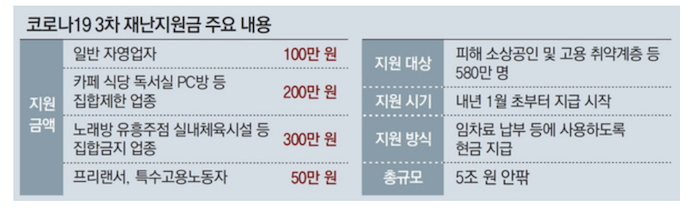 코로나 3차 대유행이 장기화 되고 있습니다. 2020년에 이미 1,2차에 걸쳐서 재난지원금을 지원했음에도 불구하고 자영업자 및 소상공인의 경제적 피해가 심각한 상황입니다. 이에 정부에서는 소상공인에게 최대 300만원의 3차 재난지원금을 내년 1월 부터 지급할 예정이라고 발표했습니다.