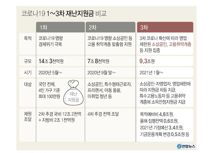 이번 시간에는 3차 재난 지원금 지급 관련하여 지급대상과 지급금액. 업종별 차등지급금액 / 지급시기 및 신청방법에 대해 알아볼까 합니다. 아울러 소상공인 금융지원 /착한임대인 세액공제 및 기타지원 / 3차 재난지원금 예상규모 및 지원대상에 대해 정리를 했으니 아래 글을 잘 참고하셔서 빠짐없이 혜택 받으시길 바랍니다.