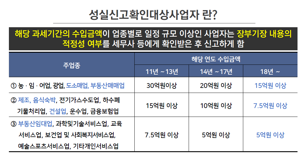 해당 과세기간의 수입금액 이 업종별로 일정 규모 이상인 사업자는 장부기장 내용의 적정성 여부 를 세무사 등에게 확인받은 후 신고하게 함
