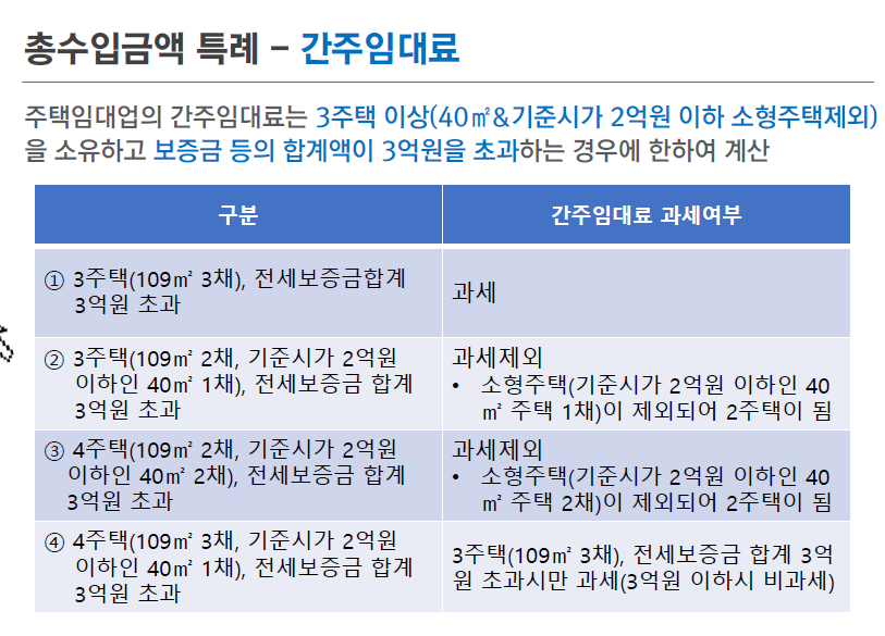 - 3 주택이상 보유자 : 보유 주택의 월세 수입과 보증금에 대한 간주임대료